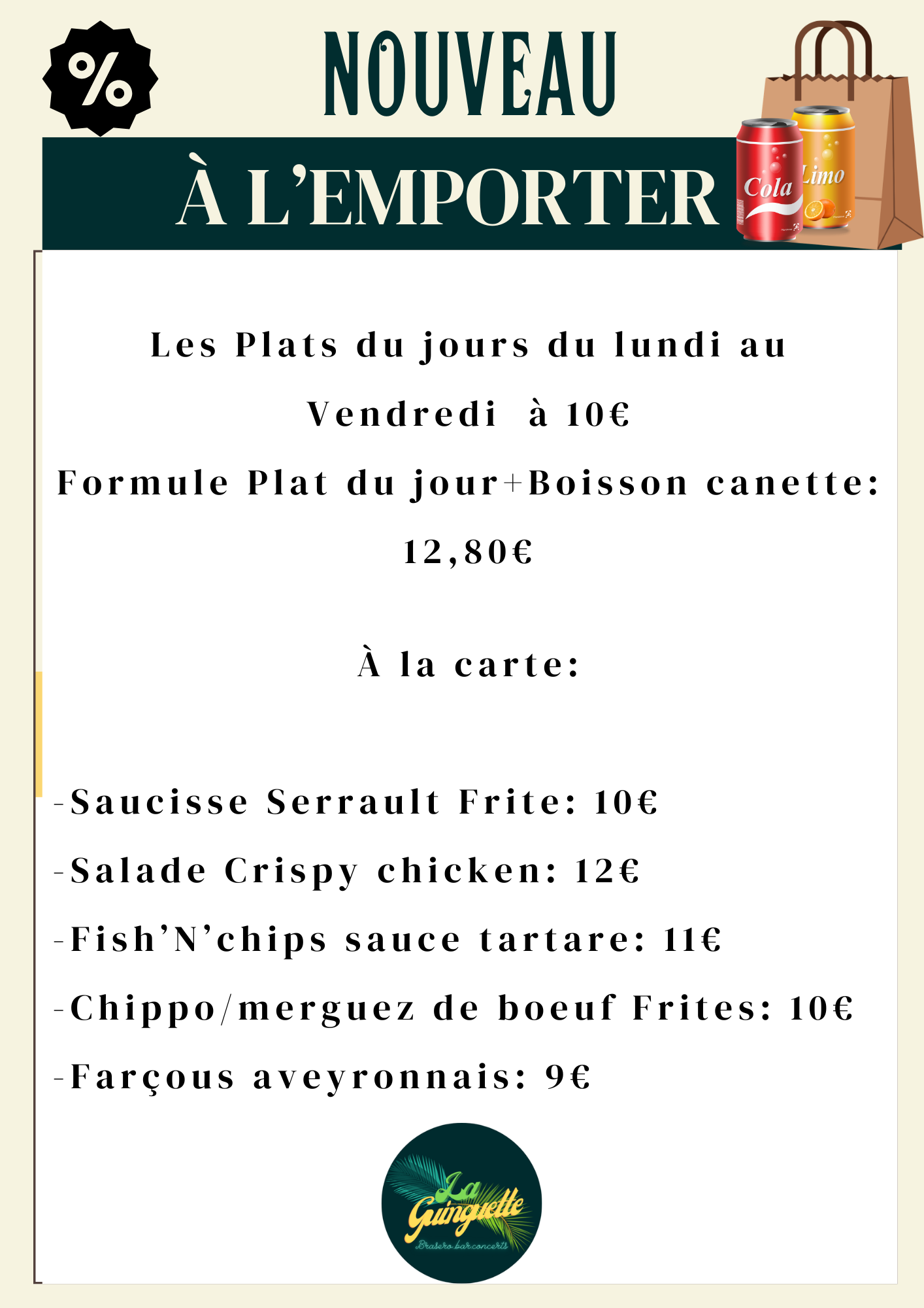 La Guinguette vous propose tous les jours un service à emporter.
